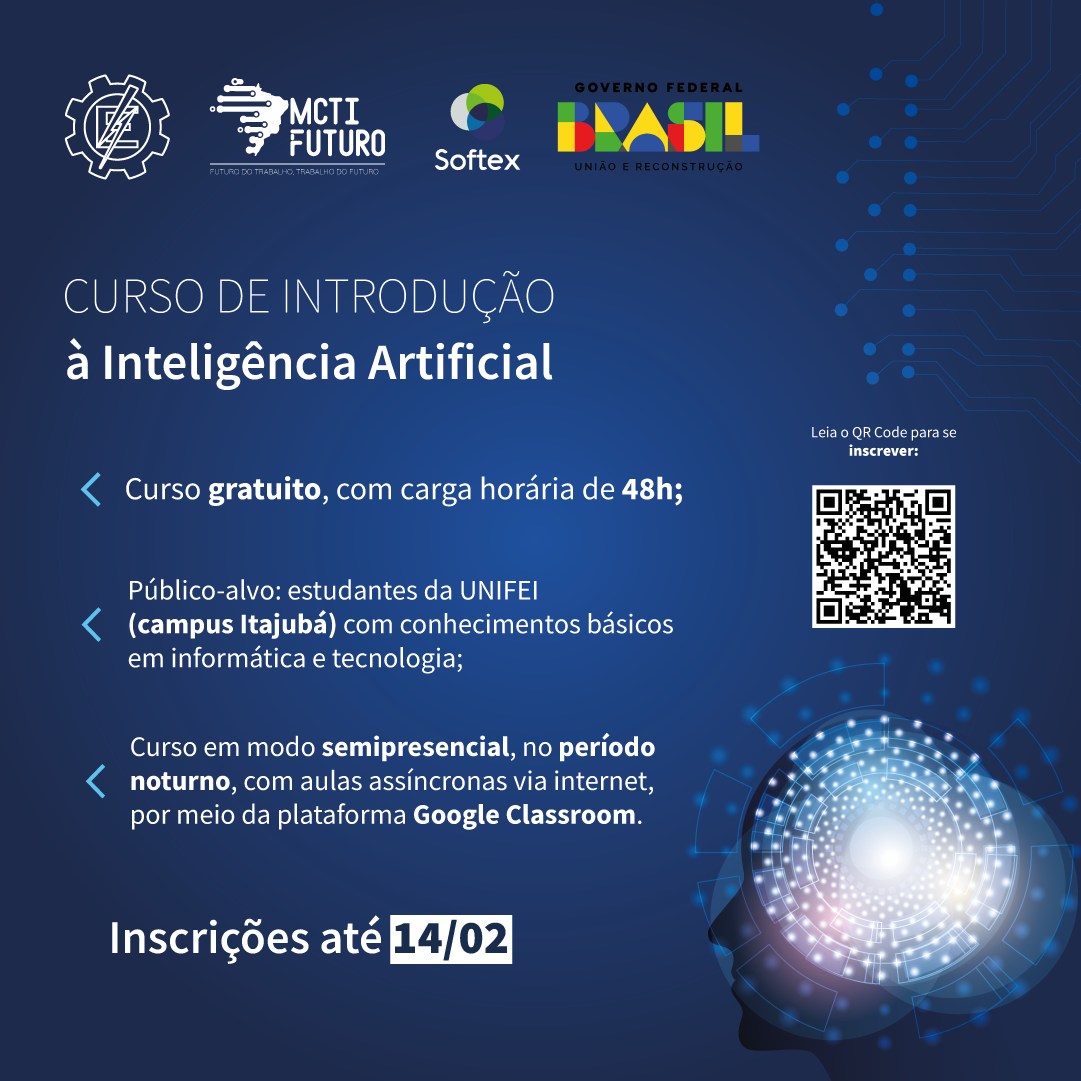 Este curso de capacitação em Inteligência Artificial, se encontra inserido dentro dos objetivos do projeto de extensão: Residência em TIC 08, registrado na PROEX por meio do processo 23088.035194/2022-61 e celebrado entre a Universidade Federal de Itajubá e a Associação para Promoção da Excelência do Software Brasileiro - SOFTEX, com interveniência da Fundação de Pesquisa e Assessoramento à Indústria (FUPAI). Cabe ser observado, que a carga horária alocada neste curso, aos docentes e discentes integrantes do projeto, é a mesma já aprovada no processo 23088.035194/2022-61 (Residência em TIC 08), sendo este curso registrado para fins de geração de certificado para os alunos que serão matriculados. Dessa forma, ressalta-se, que não há sobreposição de carga horária aos participantes.