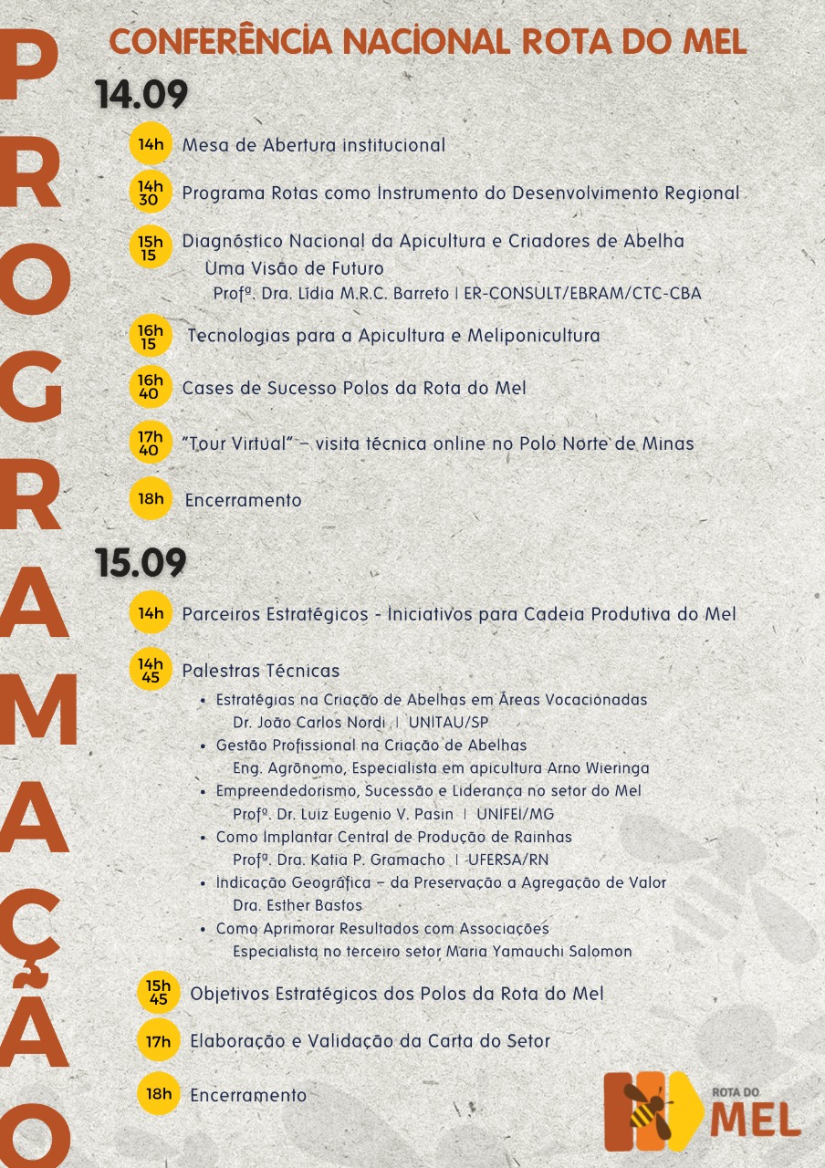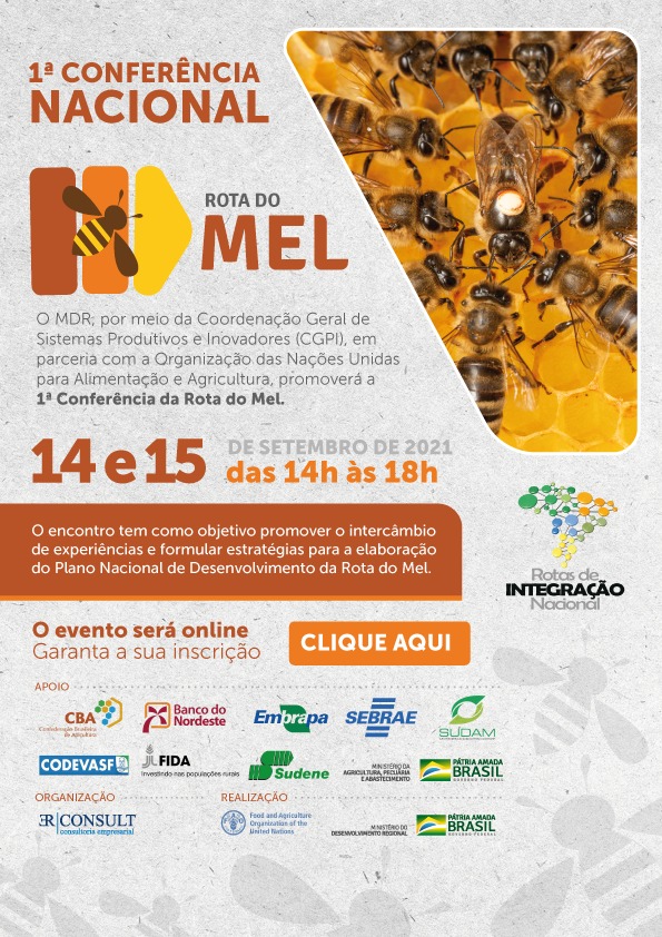 O MInistério do Desenvolveimnto Regional por meio da Coordenação Geral de Sistemas Produtivos e Inovadores em parceria com a Organização das Nações Unidas para Alimentação e Agricultura promoverá a Primeira Conferência Nacional da Rota do Mel.