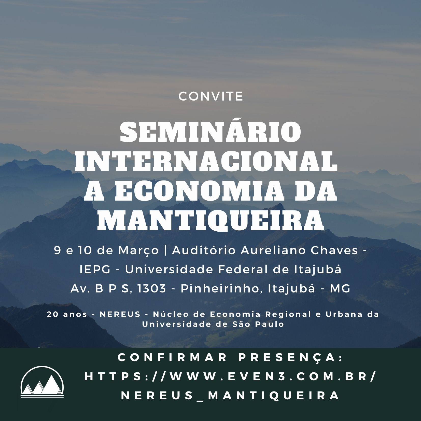 O Seminário Internacional “A Economia da Mantiqueira” consistirá em dois eventos presenciais com foco na interlocução com públicos-alvo distintos. O primeiro evento, direcionado às lideranças políticas e empresariais da Região, será realizado em Itajubá-MG, no auditório da UNIFEI, e terá como objetivo apresentar e discutir os resultados dos estudos relacionados ao diagnóstico estrutural regional e suas implicações para o desenvolvimento local.