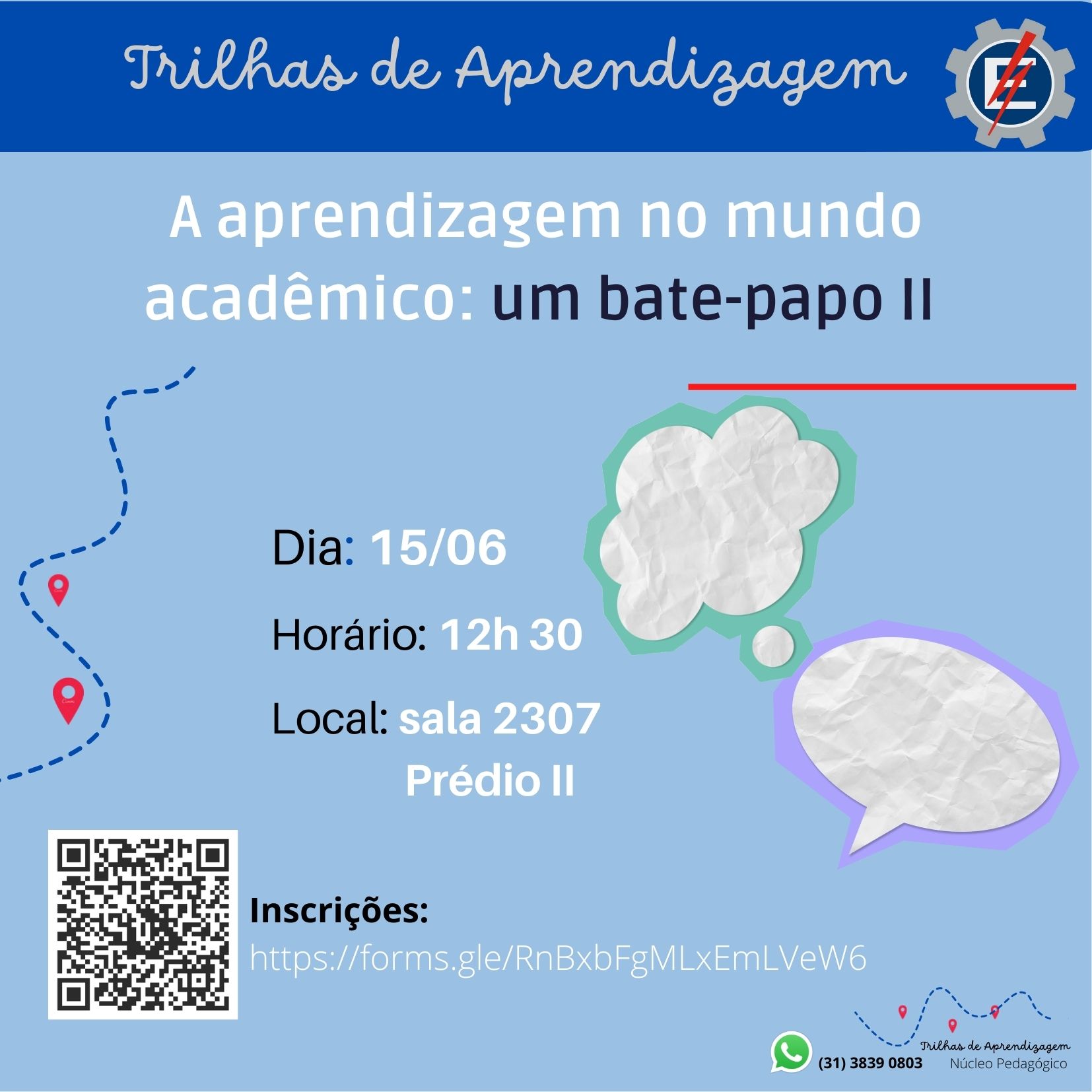 Trilha de Aprendizagem Aprender a aprender: um bate-papo sobre o mundo acadêmico II, realizado no dia 15/06/2022 sala 2307.