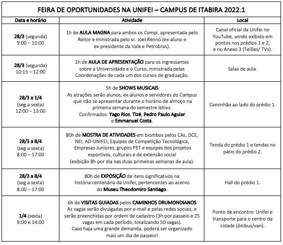 “Prezados Diretores de UAs e Coordenadores de Cursos de Graduação oferecidos no Campus de Itabira da Unifei, bom dia! Nós da Coordenação de Extensão do Campus de Itabira (COEX), em parceria com a Coordenação de Ensino de Graduação (CEG), o Núcleo Pedagógico e outros setores do Campus estamos promovendo um evento para o retorno às atividades presenciais, a "Feira de Oportunidades 2022 - 1a. edição".